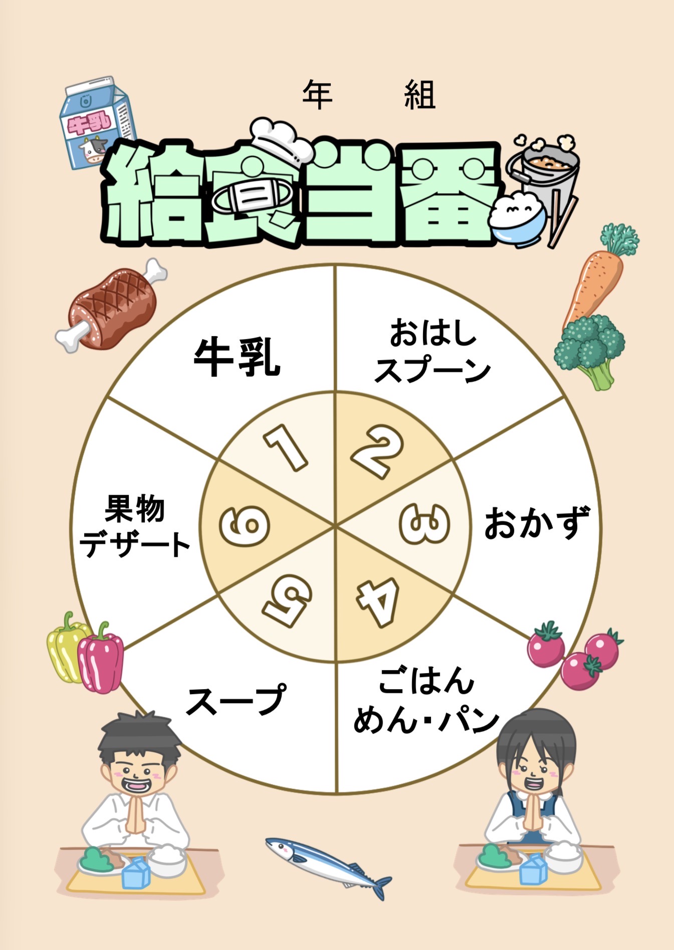 給食当番表のイラストです。(給食、当番、学校) 学校の給食当番を決めるときに使える円形の当番表のイラ […] -