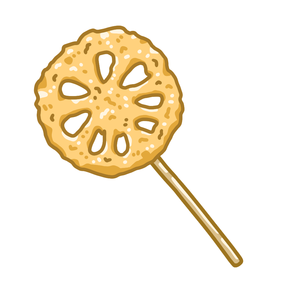 串カツ(蓮根)のイラストです。(串カツ、れんこん、野菜、揚げ物、串料理、屋台、食べ物、根菜)