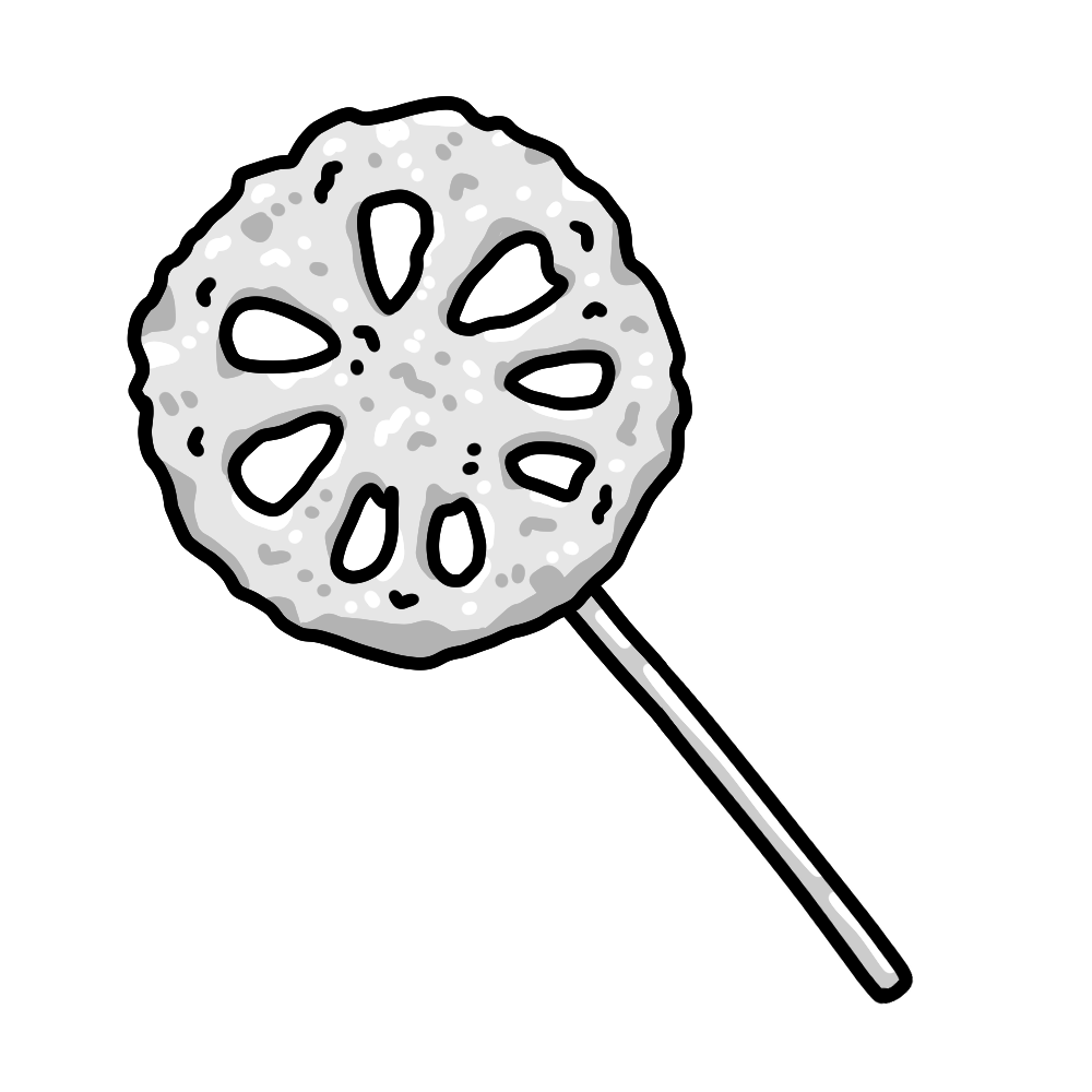 このイラストは、輪切りにした蓮根(れんこん)を串に刺して衣をつけて揚げた、野菜の串カツを描いたデザインです。シャキシャキした歯ごたえと素朴な味わいが特徴で、野菜の中でも人気の高い具材の一つ。行事食や屋台メニュー、食育資料などにも活用しやすい素材です。