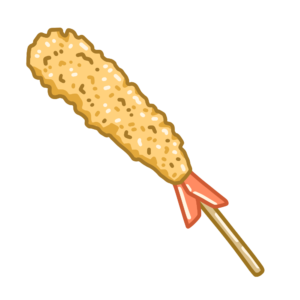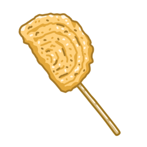 このイラストは、うずらの卵や餅を具材に使った変わり種の串カツを描いたデザインです。小さくて丸い形が可愛らしいうずら卵や、もっちりとした食感が特徴の餅は、子どもから大人まで人気の具材。関西の串カツ文化の中でも個性のある素材として、食育や行事、屋台の紹介などにぴったりです。