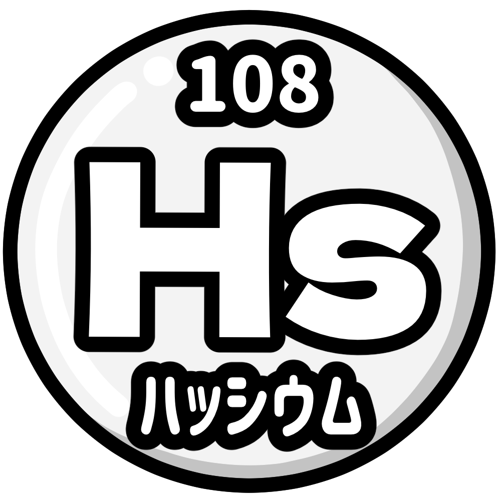 ハッシウムは、原子番号108の人工放射性元素で、超重元素のひとつです。1984年にドイツのダルムシュタット重イオン研究所で合成され、発見地であるドイツの州「ヘッセン」(ラテン語で「ハッシア」)にちなんで命名されました。自然界には存在せず、半減期が非常に短いため、主に原子核物理の研究対象として扱われています。科学史や元素の命名を学ぶ教材として適した、シンプルで視認性の高いデザインです。