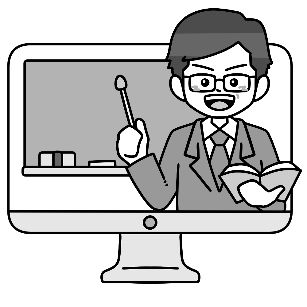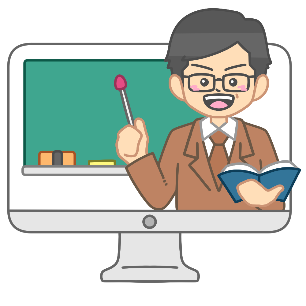 パソコンの画面から、笑顔の先生が教科書と差し棒を持って授業をしている様子を描いたイラストです。落ち着いた雰囲気で親しみやすく、オンライン授業やリモート学習を紹介する資料、学校通信、授業スライドなどにぴったりです。