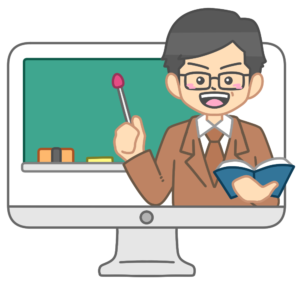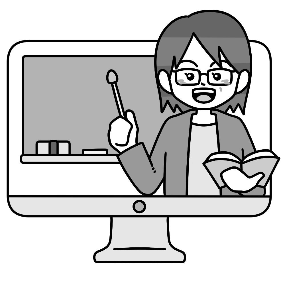 パソコンの画面から、笑顔の先生が教科書と差し棒を持って授業をしている様子を描いたイラストです。落ち着いた雰囲気で親しみやすく、オンライン授業やリモート学習を紹介する資料、学校通信、授業スライドなどにぴったりです。