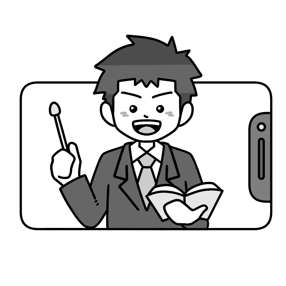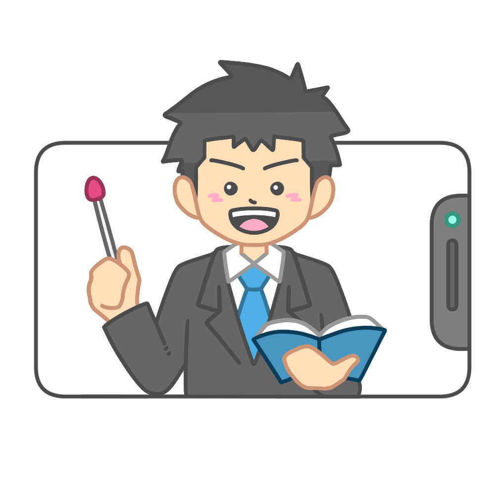 スマートフォンの画面内に登場し、教科書と差し棒を手に明るい表情で授業をしている若い先生のイラストです。スマホを使ったオンライン授業や家庭学習、オンライン塾・家庭教師の紹介にぴったりなイメージです。