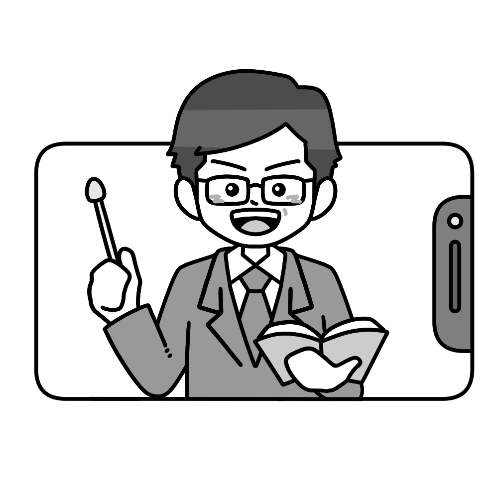 スマートフォンの画面の中で、中年の先生が教科書と差し棒を持って授業をしているイラストです。親しみやすく落ち着いた雰囲気で、オンライン塾や家庭教師、スマホを活用した学習環境の紹介にも適しています。