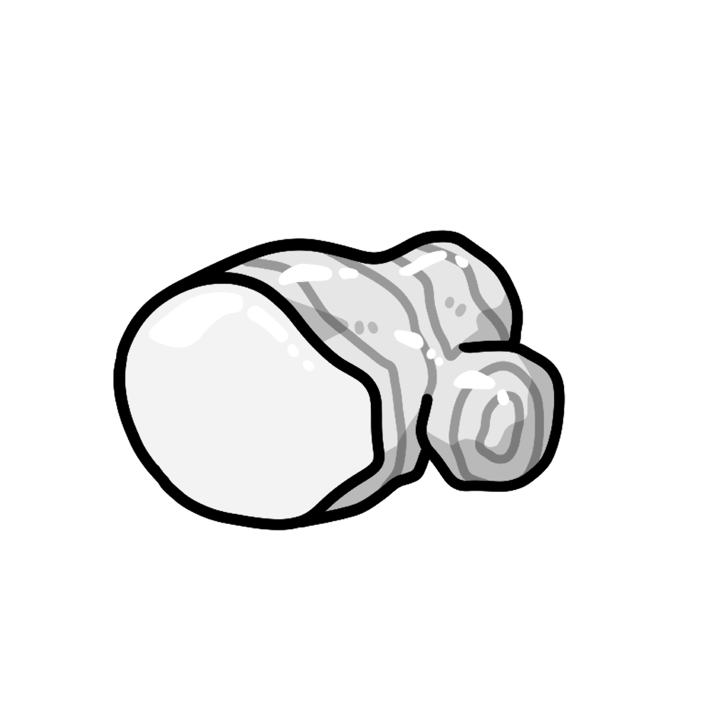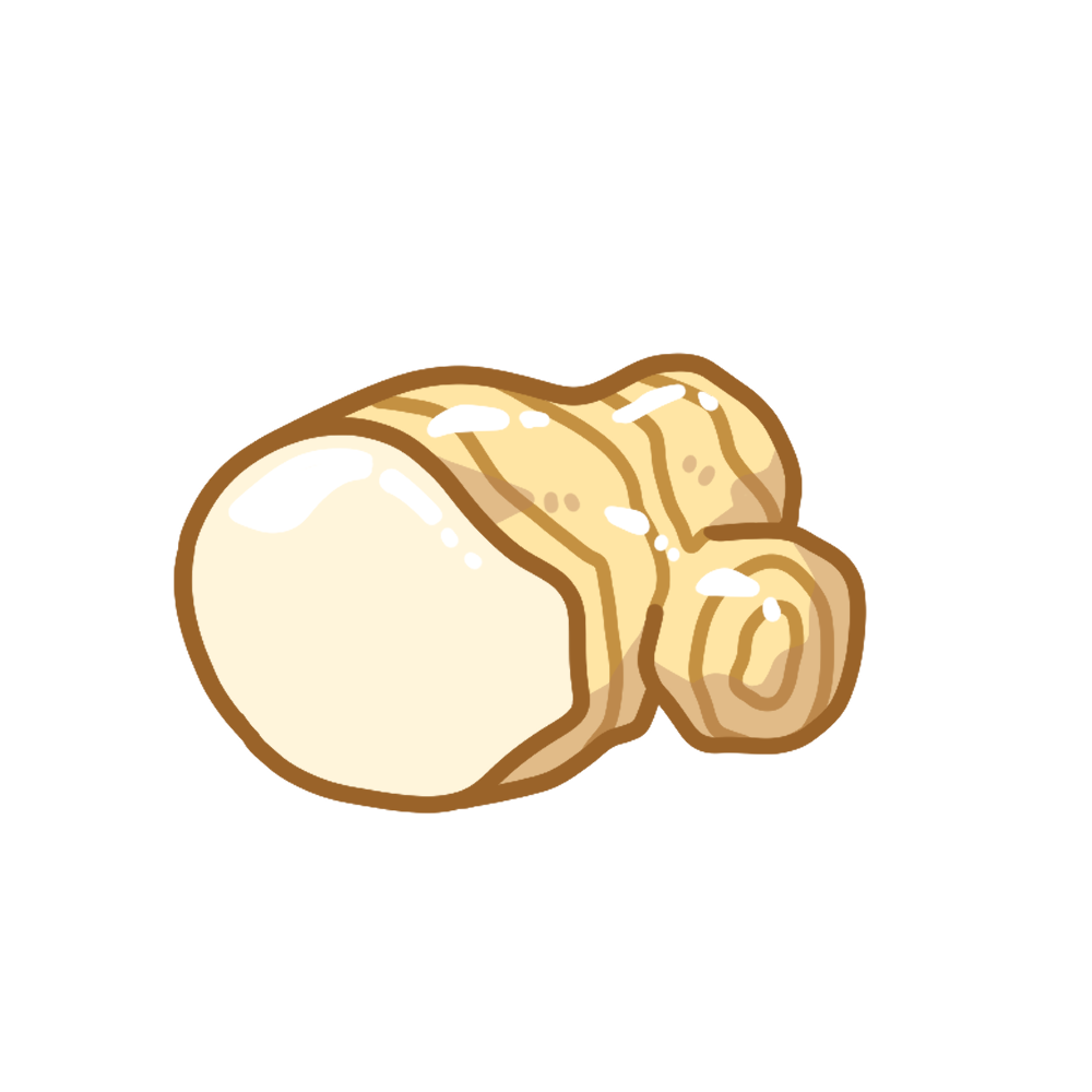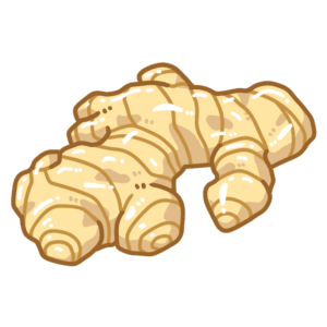 丸みのある生姜の形をそのままに、先端部分が一か所だけカットされ、内側の明るい色合いの断面が見えるデザインです。表面は茶色く、つやのある質感で描かれており、生のままの生姜の特徴がシンプルに表現されています。