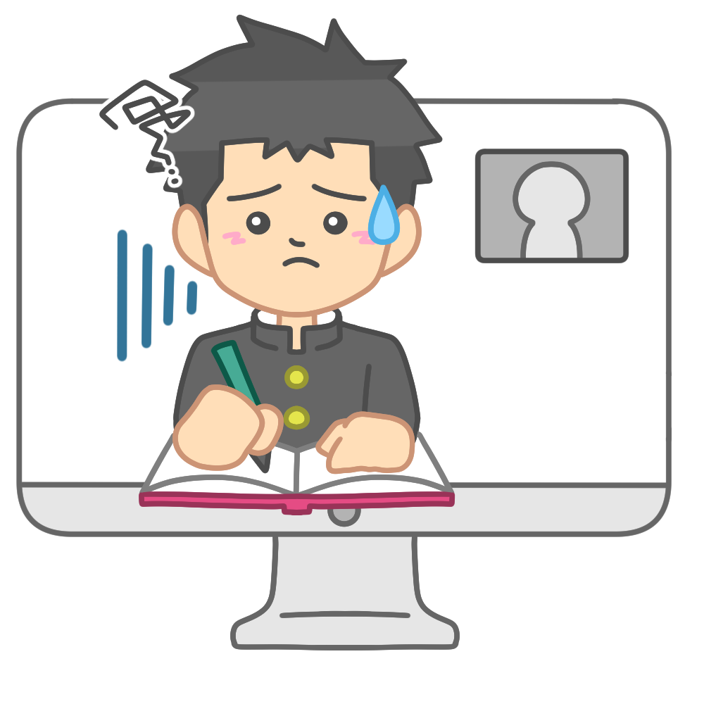 パソコン画面を見つめながら、少し困った表情を浮かべている生徒の様子を描いたイラストです。ノートを取りつつも、内容が難しかったり通信環境に悩んでいたりするような、リアルなオンライン学習の一場面を表現しています。