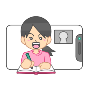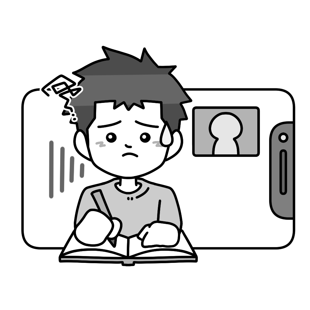 スマホの中からオンライン授業を受けて困っている児童のイラストです。(オンライン学習、ICT教育、小学生、リモート授業)
