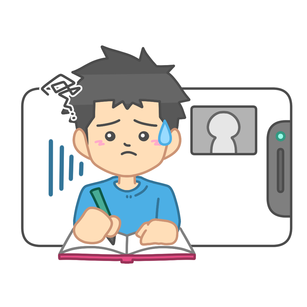 スマートフォンの画面に、困った表情で授業を受ける児童が映っている様子。首をかしげたり眉を寄せたりしており、理解が追いつかない瞬間や通信トラブルなどの状況をイメージできます。オンライン学習における課題やサポートの必要性を伝えるのに適した一枚です。