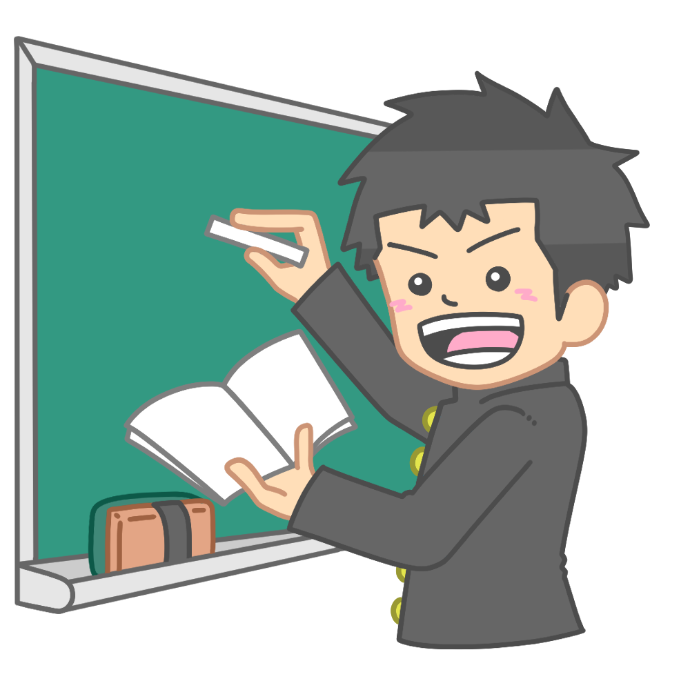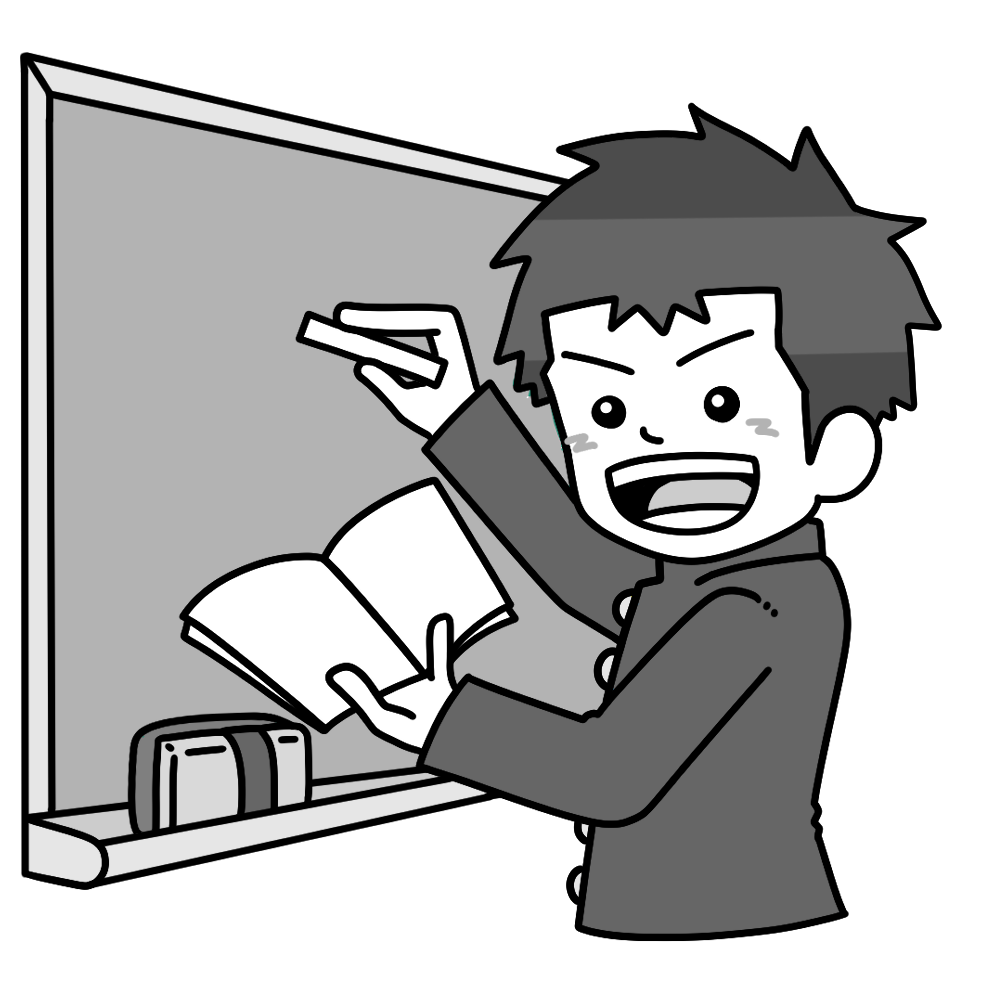 黒板に自分の考えを板書する学ランを着た男子生徒のイラストです。(学校、授業風景、発表、学び、主体的学習)