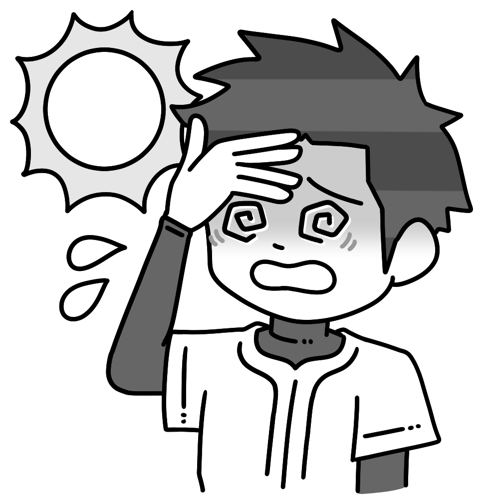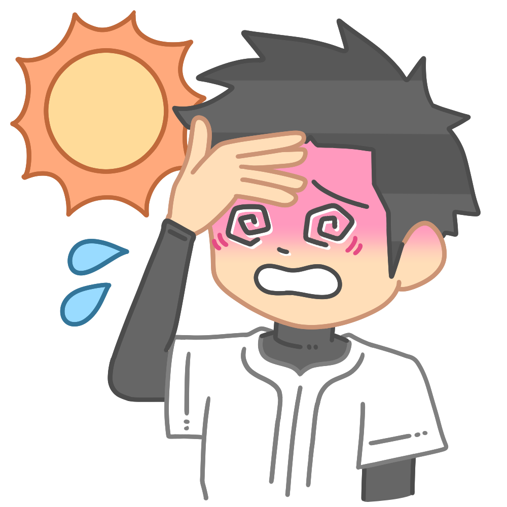 熱中症の野球選手 投稿日 2025-08-16 更新日 2025-11-22 著者 hista006 カテゴリー 保健室 カテゴリー 野球 太陽の下で目が回っている野球選手のイラストです。(熱中症、野球部、スポーツ、夏、体調不良、注意喚起)炎天下のグラウンドで、ユニフォームを着た選手がふらつきながら目を回している様子。強い日差しの中でのスポーツ活動における熱中症の危険性をわかりやすく伝える一枚です。 【使い方アイデア】・熱中症予防の啓発資料やポスターに・夏のスポーツ活動における安全指導教材に・学校や部活動での健康管理の注意喚起イラストに・地域や行政の熱中症対策キャンペーンに 保健室 患者 暑い 汗 熱中症 部活 野球