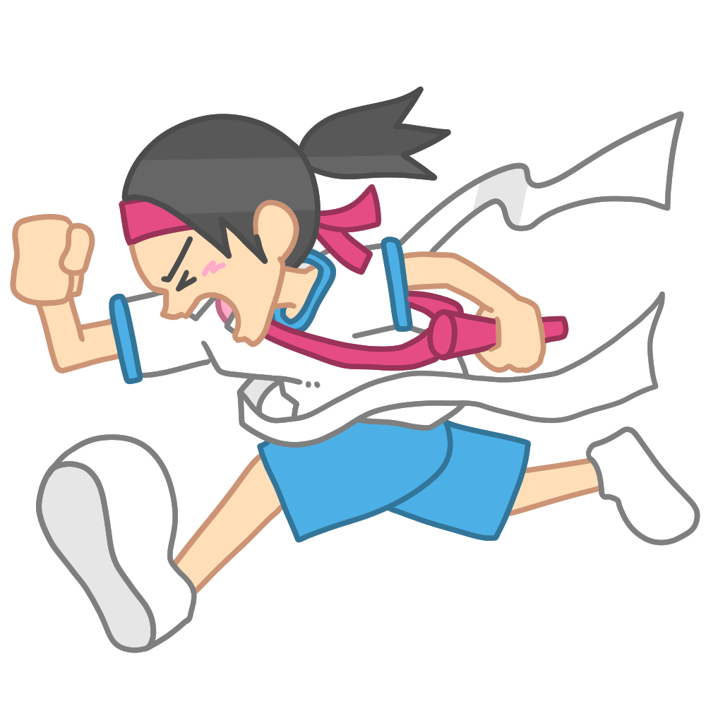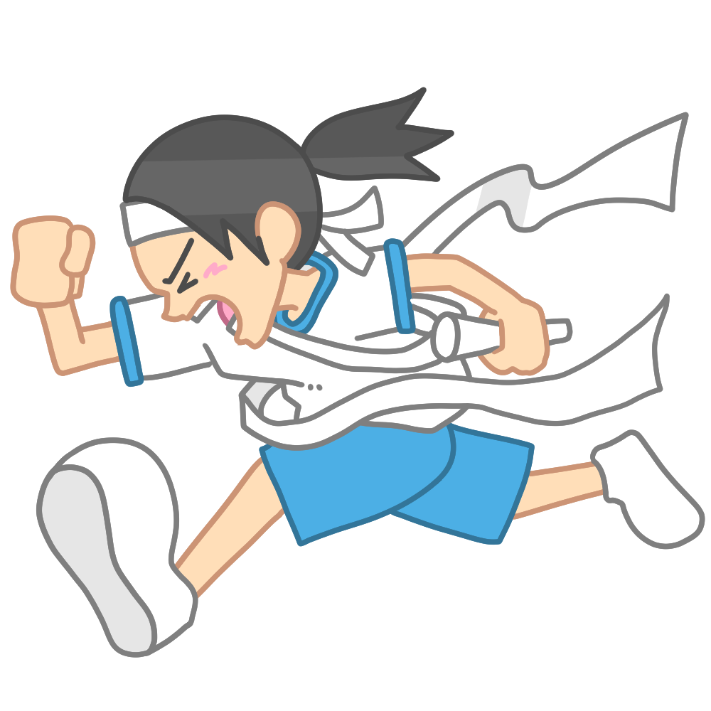 リレーのアンカー(体操服女子) 投稿日 2025-09-04 著者 hista006 カテゴリー 運動会 リレーのアンカーとしてゴールテープを切る体操服を着た女子生徒のイラストです。(体育、運動会、体育祭、体育大会)リレーの最後を走るアンカーの女子生徒が、全力で駆け抜けてゴールテープを切る瞬間を描いたイラストです。運動会や体育祭の盛り上がる場面として活用できる素材です。 【使い方アイデア】・運動会や体育祭のポスターやプログラムに・学校だよりや学年だよりの挿絵に・体育大会の案内資料に・リレーの説明やイメージカットとして ゴール リレー 体操服 体育 体育大会 体育祭 走る 運動会 鉢巻