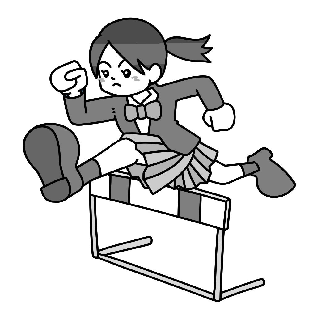 制服を着た女子生徒がハードルを跳んでいる姿を描いたイラストです。壁を乗り越える、困難に挑戦する、といった比喩的なシーンの表現としても使いやすく、生徒会活動や進路指導の場面で活用できます。
