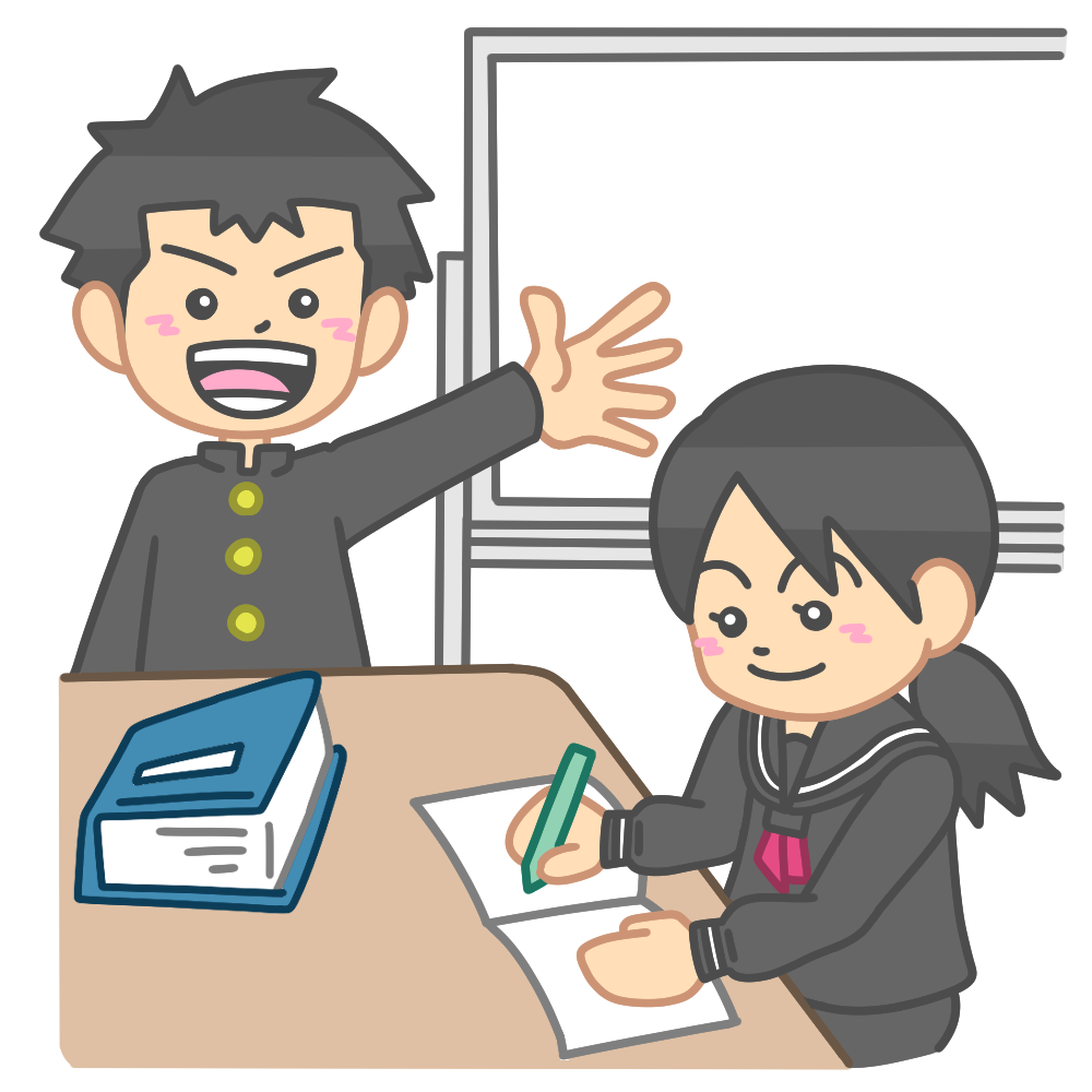 体育祭や運動会、体育大会、文化発表会、文化祭、合唱コンクール、修学旅行などの学校行事に向けて、生徒たちが集まって相談している様子を表したイラストです。真剣に意見を出し合う姿の中に協力や責任感が感じられ、学校生活の大切な一場面を切り取ったイメージです。