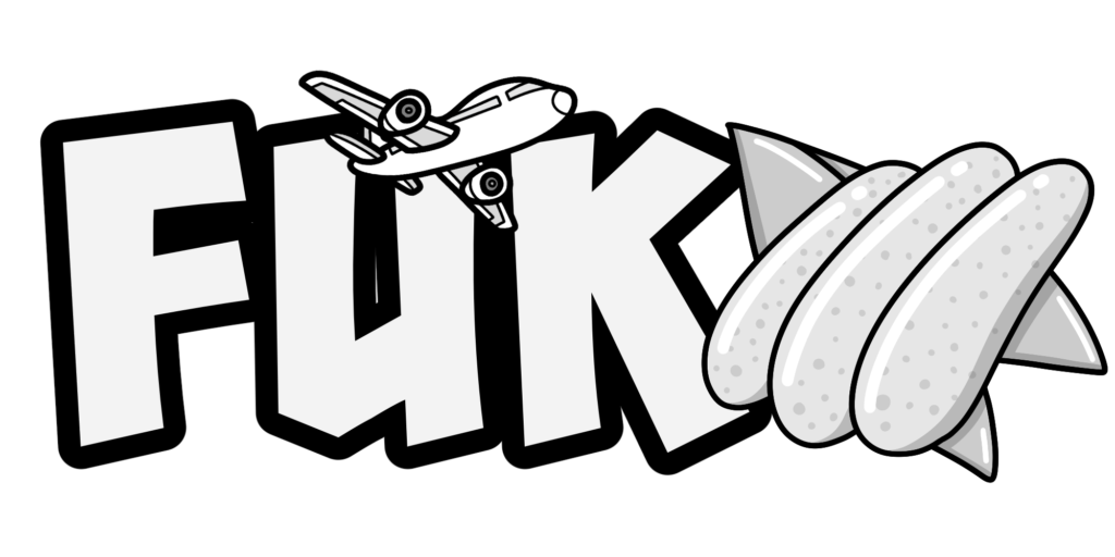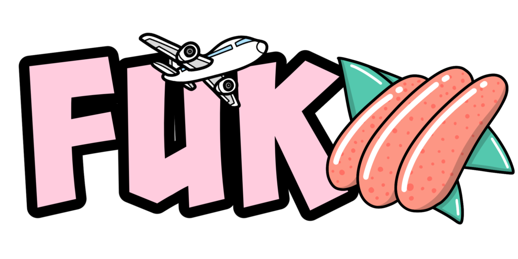 福岡の名物・明太子をモチーフにした「FUK(福岡空港)」の文字イラストです。アルファベット表記で空港らしさを出しながら、地域の特色も伝わるデザインになっています。観光案内や地理学習、旅行関連の掲示などにも使いやすいイラストです。