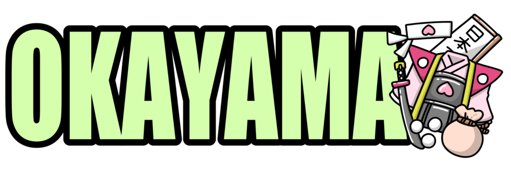 桃太郎の衣装をモチーフにした「OKAYAMA」の文字イラストです。岡山県を象徴する昔話「桃太郎」をテーマにしたデザインで、観光や郷土学習、文化紹介などにも使いやすいイラストです。