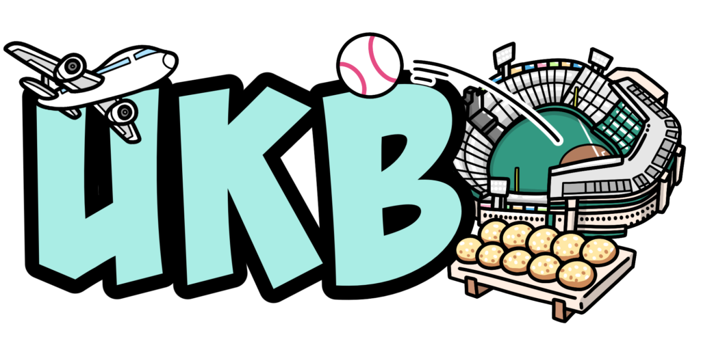 甲子園球場と兵庫名物の明石焼を組み合わせた、神戸空港の空港コード「UKB」の文字イラストです。スポーツとグルメの両方の魅力を伝えるデザインで、旅行や地域紹介、空港案内の資料にもぴったりです。