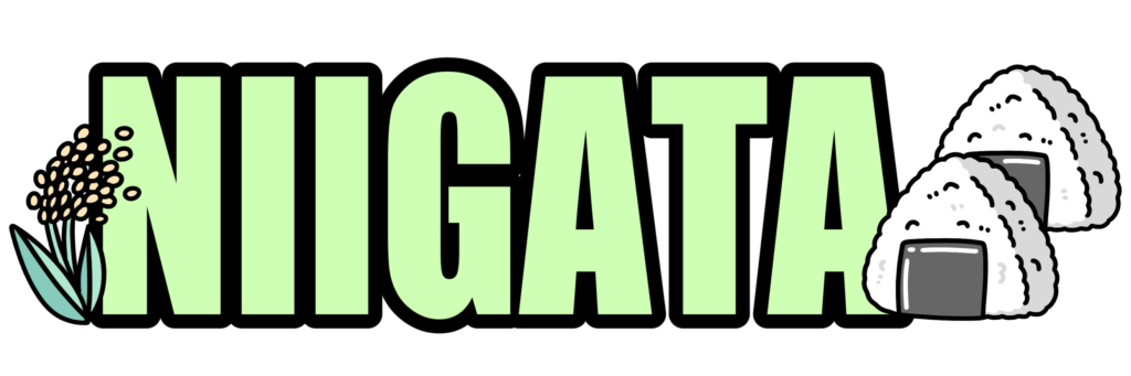 稲とおにぎりを添えた「NIIGATA」の文字イラストです。