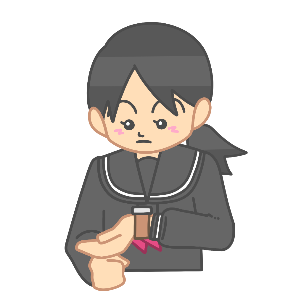 腕時計を見るセーラー服女子 投稿日 2025-12-28 著者 hista006 カテゴリー 中学生・高校生 腕時計を見ているセーラー服を着た生徒のイラストです。(時間、確認、学校生活)時間を意識して行動しようとする様子が分かりやすく、授業の始まりや移動時間、待ち合わせなどの場面を表したいときに使いやすい素材です。学校生活に身近な行動のため、時間管理の大切さを伝える教材や生活指導の資料にも取り入れやすく、状況説明にも役立ちます。 【使い方アイデア】• 時間を守ることを伝える生活指導教材に• 授業や活動の切り替えを示す資料に• 学校掲示や学級通信の挿絵に セーラー服 受験 時計 時間 生徒指導