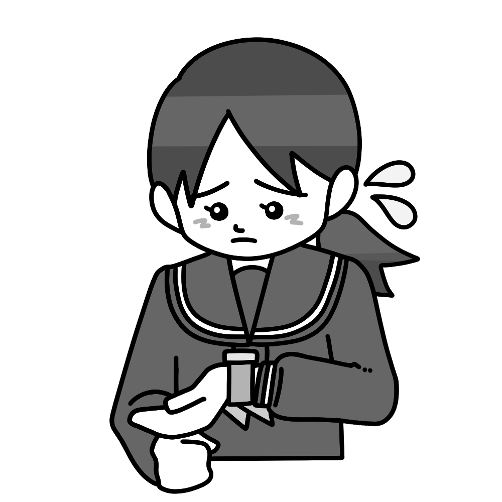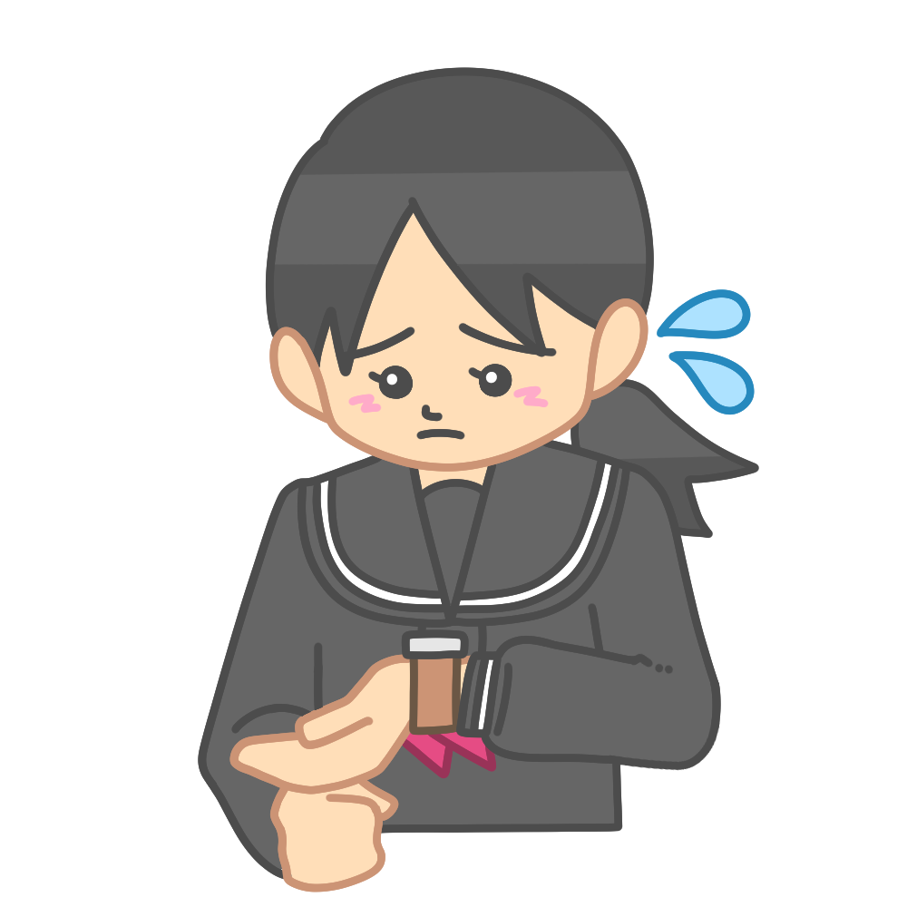腕時計を見て困るセーラー服女子 投稿日 2025-12-28 著者 hista006 カテゴリー 中学生・高校生 腕時計を見て困っているセーラー服を着た生徒のイラストです。(時間、遅刻、学校生活)時間が足りないことに気づいた場面や、予定に間に合わないかもしれない不安な気持ちが伝わりやすいイラストで、学校生活の中の困りごとを表現したいときに使いやすい素材です。時間管理の大切さや行動の振り返りを促す教材としても活用できます。 【使い方アイデア】時間を守ることを考える生活指導教材に授業や行事の振り返り資料に学級通信や学校掲示の挿絵に セーラー服 受験 困る 時計 時間 遅刻