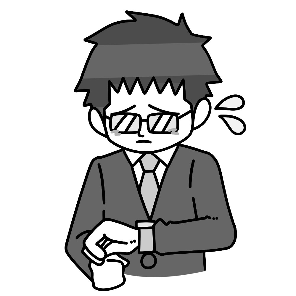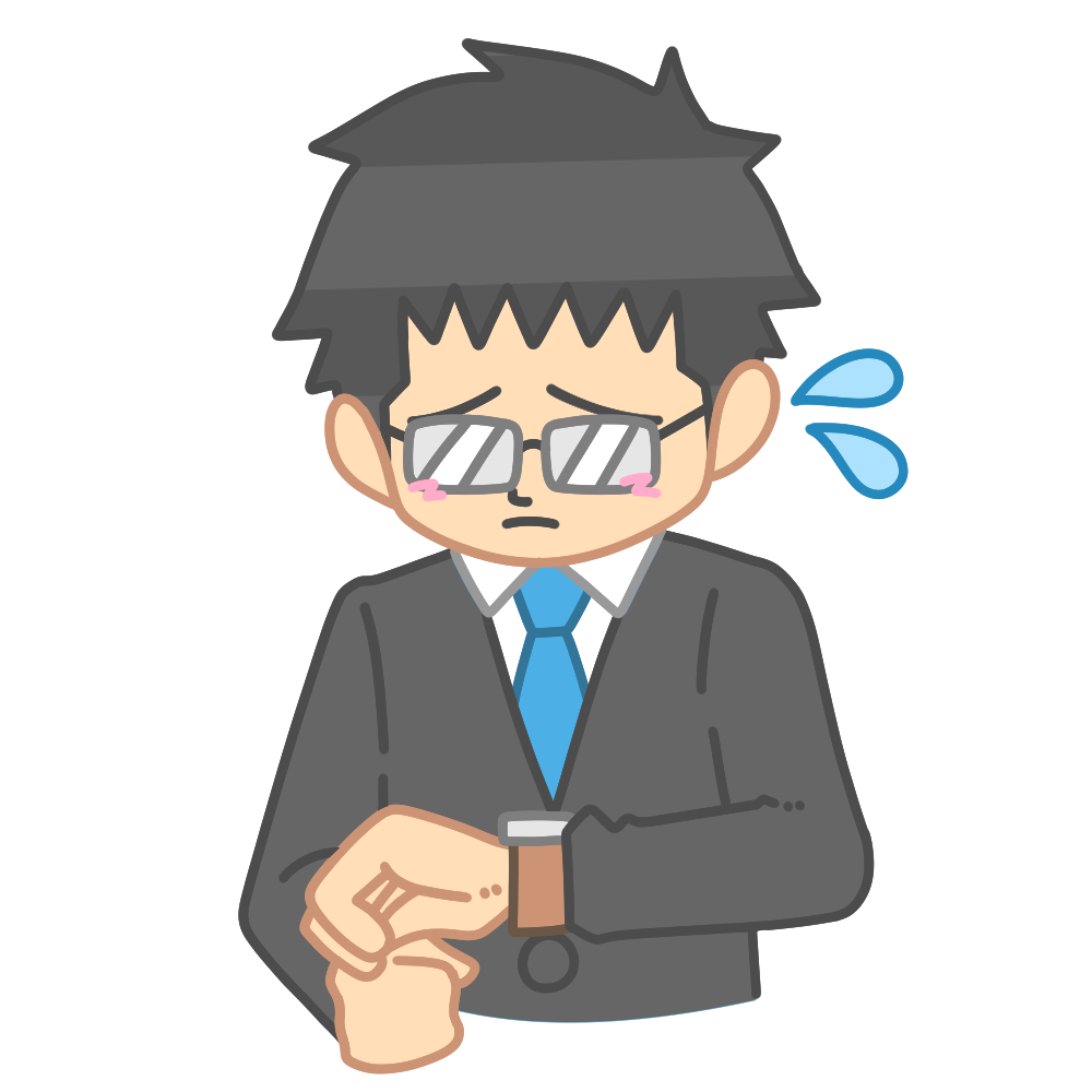 スーツ姿の男性が時間を確認して戸惑っている様子が分かりやすく、仕事中のサラリーマンや授業に向かう先生など、時間に追われる場面を表現しやすいイラストです。遅刻や予定のずれといった状況説明に使いやすく、時間管理の大切さを伝える資料にも活用できます。