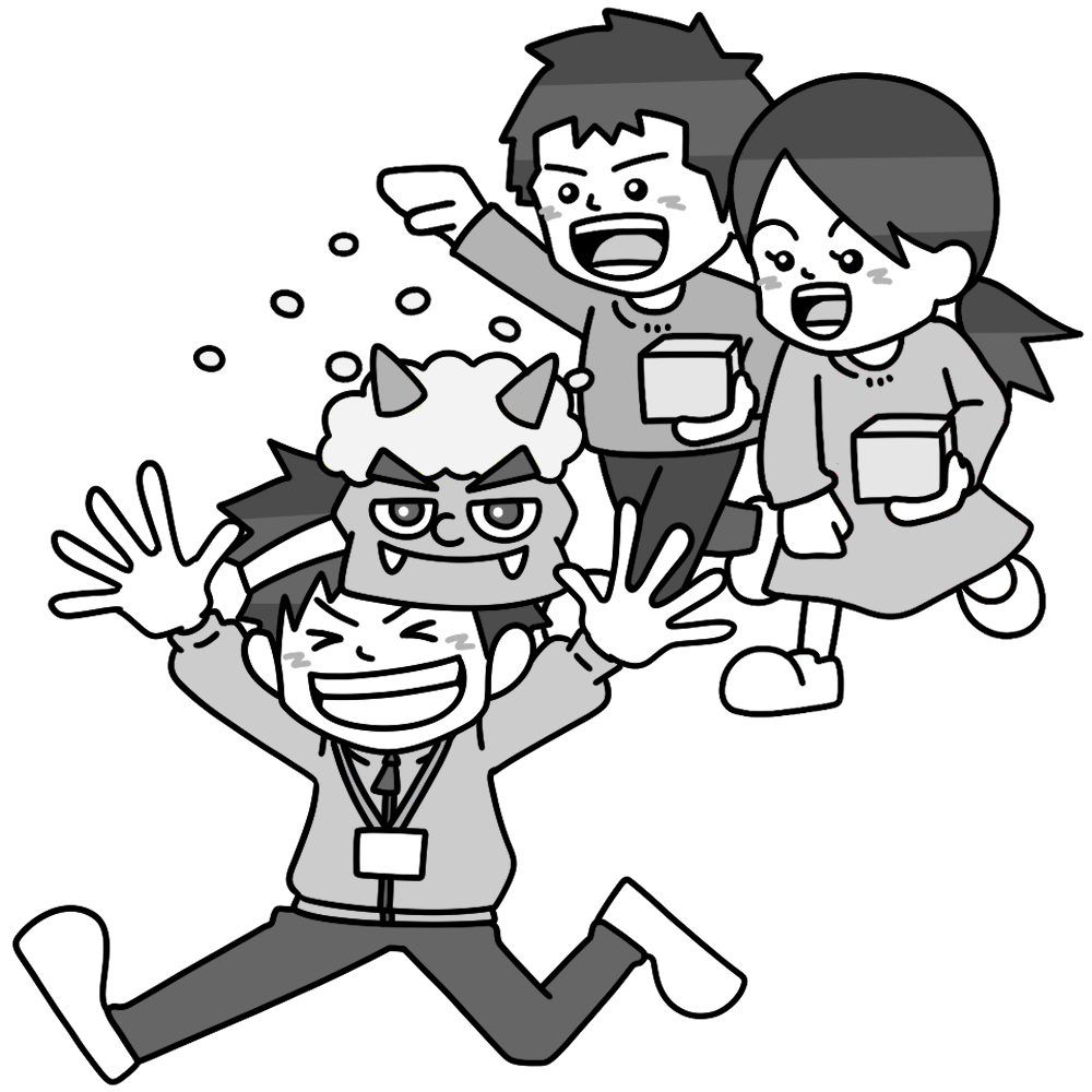 鬼役の先生(男性)に豆を投げる子ども 投稿日 2026-01-01 更新日 2026-01-03 著者 hista006 カテゴリー 節分 先生が鬼役になり、豆まきをしているイラストです。(節分、行事、先生)学校で行われる節分行事の一場面を表したイラストで、先生が鬼役になることで、楽しく親しみやすい雰囲気が伝わります。季節の行事を通して日本の伝統文化に触れる学習や、行事紹介の資料に使いやすく、子どもたちの思い出づくりを表現したい場面にも適しています。 【使い方アイデア】節分行事の事前・事後指導の教材に学校行事や季節行事の紹介プリントに学級通信や掲示物の挿絵に 先生 投げる 節分 豆 走る 逃げる 鬼