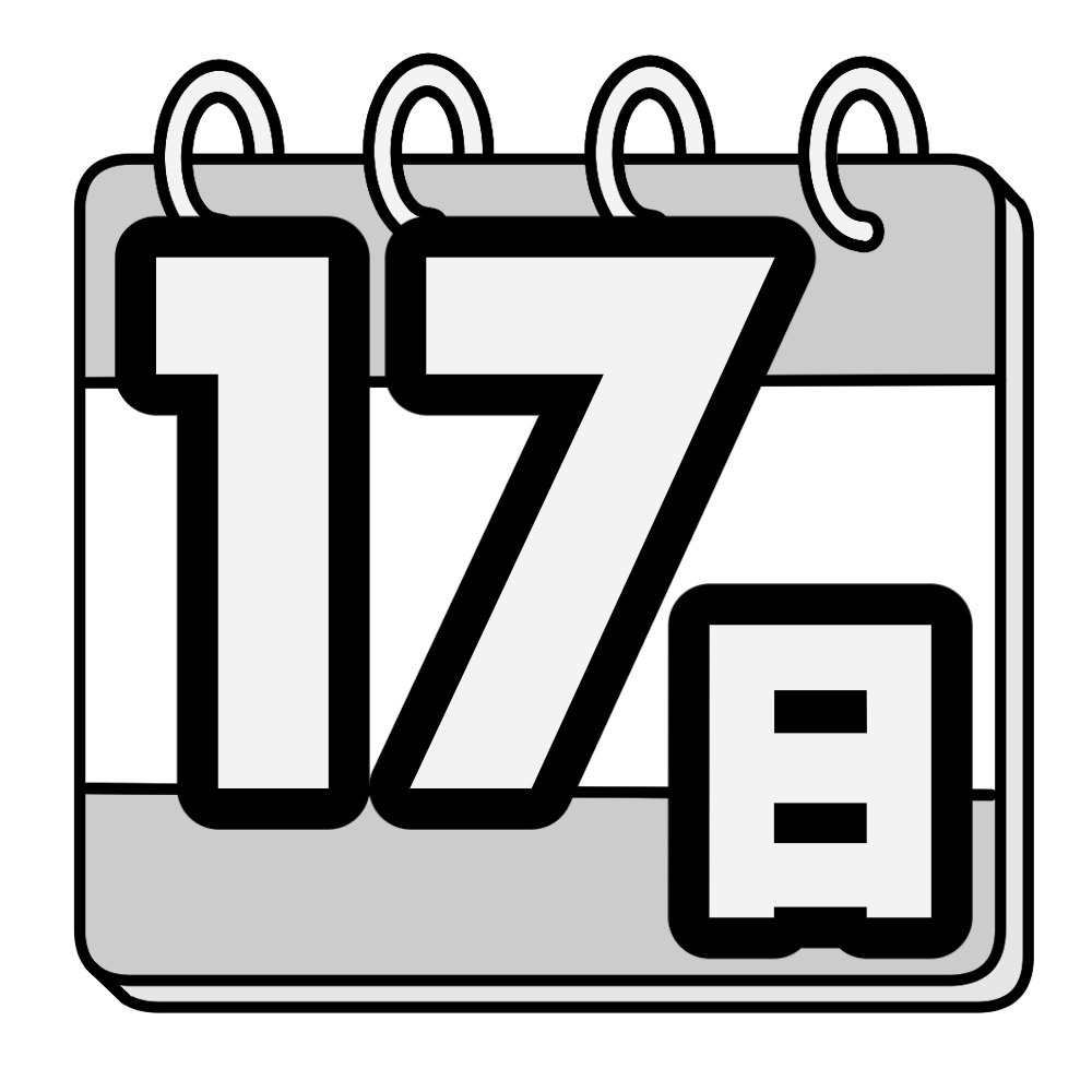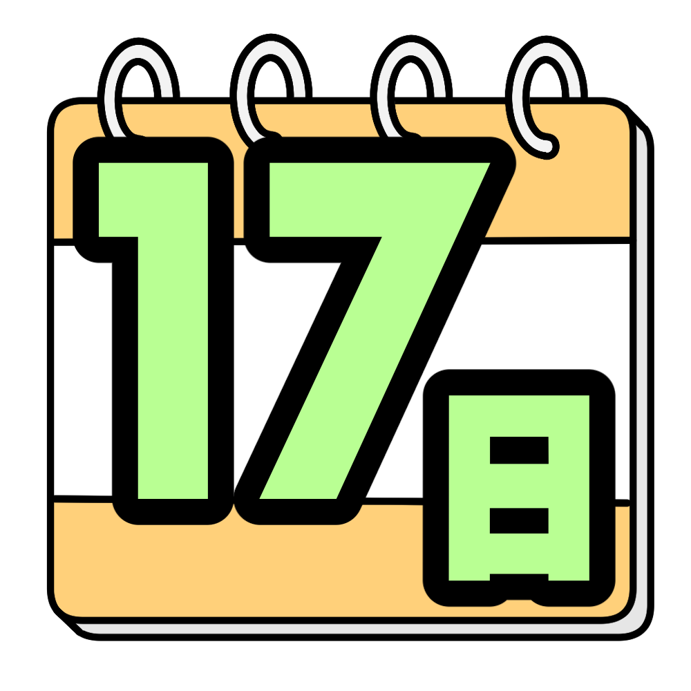 17日 投稿日 2026-01-07 著者 hista006 カテゴリー 教材 カレンダー風にデザインした日付のイラストです。(日付、数字、カレンダー、カウントダウン)大きく数字が目立つデザインなので、背面黒板や掲示物で日付を強調したい場面に使いやすく、行事までの残り日数を示すカウントダウンにも向いています。さまざまな数字と組み合わせて、年間を通して活用できるイラストです。 【使い方アイデア】背面黒板の日付表示に行事やテストまでのカウントダウンに学級通信や掲示物の日付アイコンとして カレンダー 掲示物 文字 日付