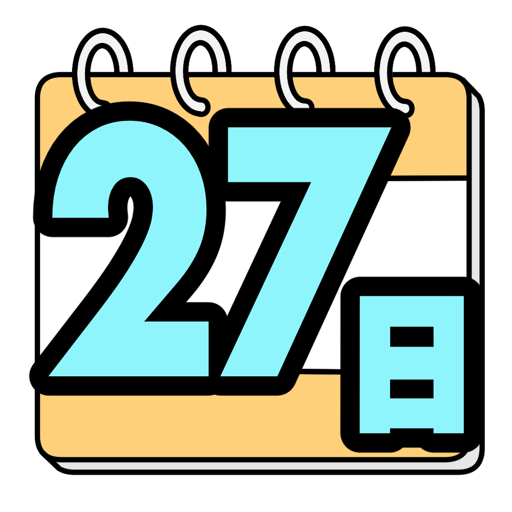 27日 投稿日 2026-01-08 著者 hista006 カテゴリー 教材 カレンダー風にデザインした日付のイラストです。(日付、数字、カレンダー、カウントダウン)大きく数字が目立つデザインなので、背面黒板や掲示物で日付を強調したい場面に使いやすく、行事までの残り日数を示すカウントダウンにも向いています。さまざまな数字と組み合わせて、年間を通して活用できるイラストです。 【使い方アイデア】背面黒板の日付表示に行事やテストまでのカウントダウンに学級通信や掲示物の日付アイコンとして カレンダー 掲示物 文字 日付