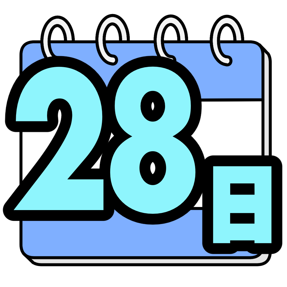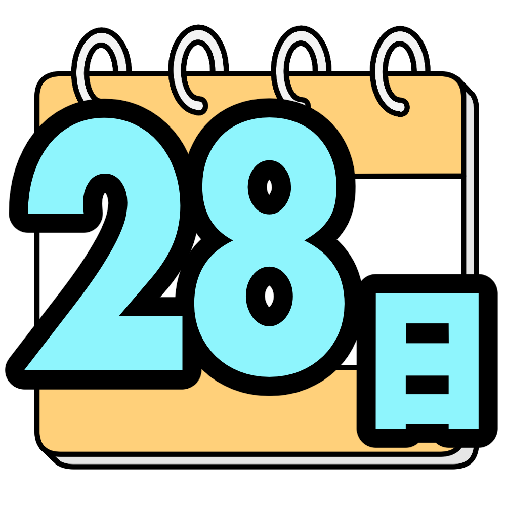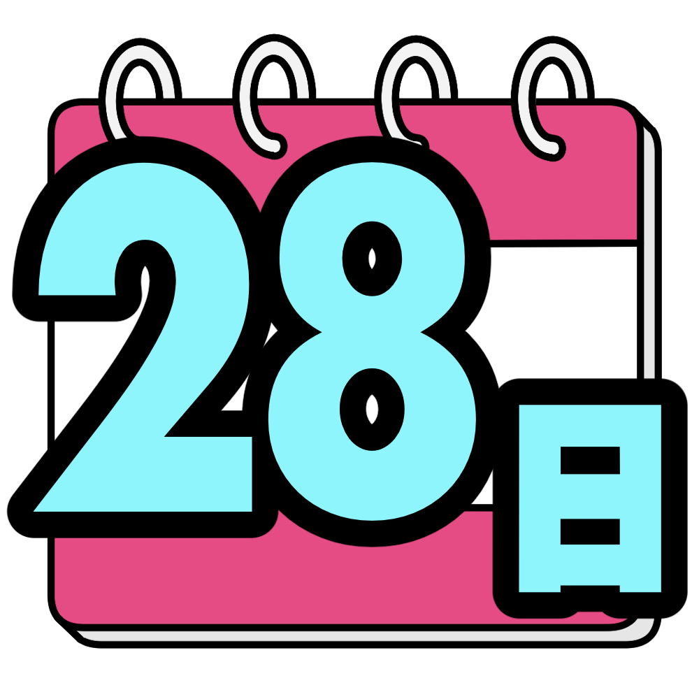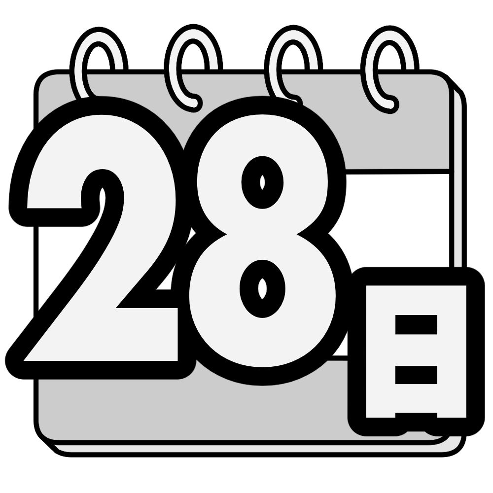28日 投稿日 2026-01-08 著者 hista006 カテゴリー 教材 カレンダー風にデザインした日付のイラストです。(日付、数字、カレンダー、カウントダウン)大きく数字が目立つデザインなので、背面黒板や掲示物で日付を強調したい場面に使いやすく、行事までの残り日数を示すカウントダウンにも向いています。さまざまな数字と組み合わせて、年間を通して活用できるイラストです。 【使い方アイデア】背面黒板の日付表示に行事やテストまでのカウントダウンに学級通信や掲示物の日付アイコンとして カレンダー 掲示物 文字 日付