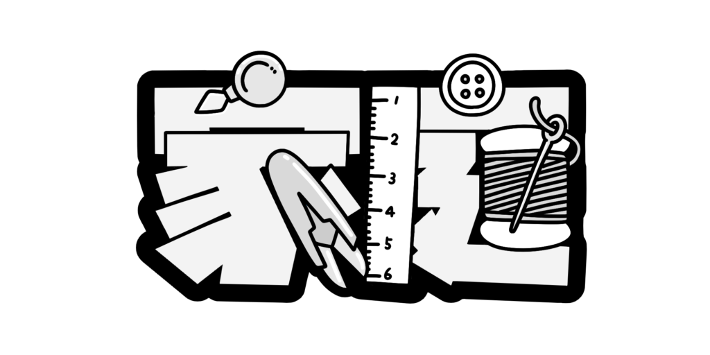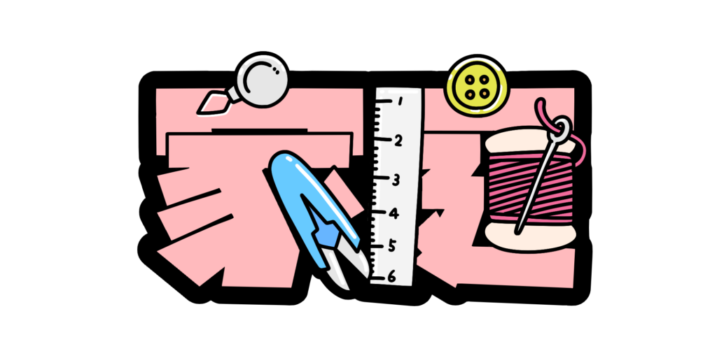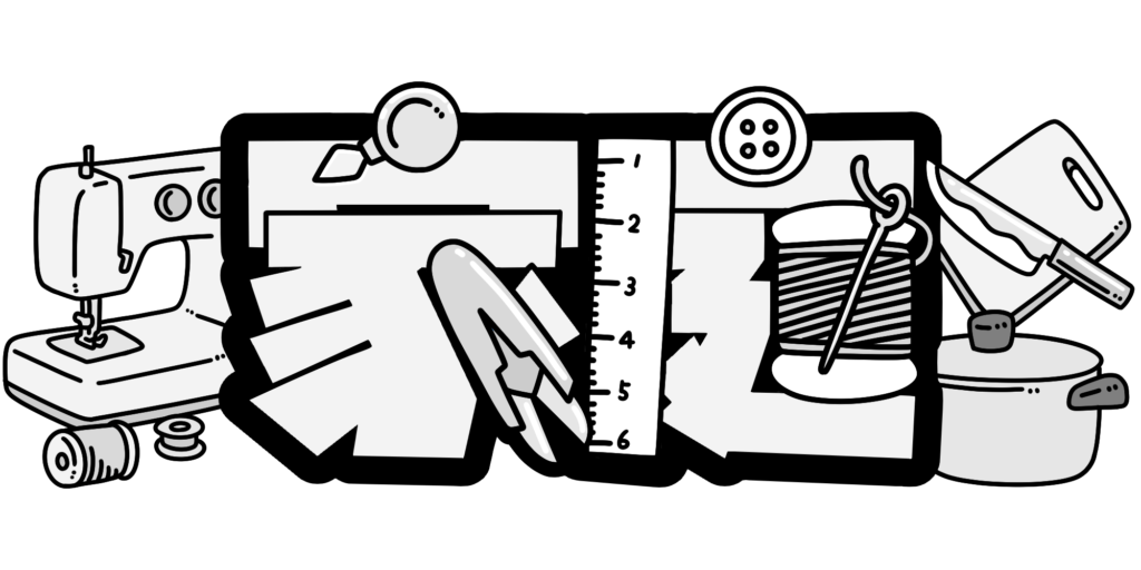 「家庭」の文字のまわりに、裁縫や調理、生活に関わる学習をイメージさせる道具を配置した、教科の内容が分かりやすい文字イラストです。暮らしに身近な要素をやさしい雰囲気で表現しており、家庭科の学びを親しみやすく伝えられるデザインになっています。