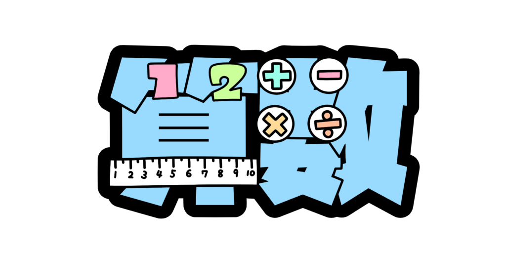 「算数」の文字のまわりに、図形や数、考える学習をイメージさせるモチーフを配置した、教科の特徴が分かりやすい文字イラストです。親しみやすくやさしい雰囲気で、算数への苦手意識をやわらげ、考える楽しさが伝わるデザインになっています。
