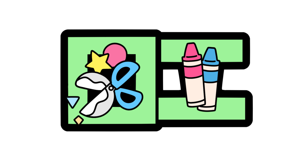 クレヨンやスケッチブック、はさみなどの道具を添えた図工の可愛い文字イラストです。(図工、文字イラスト、学習、工作)