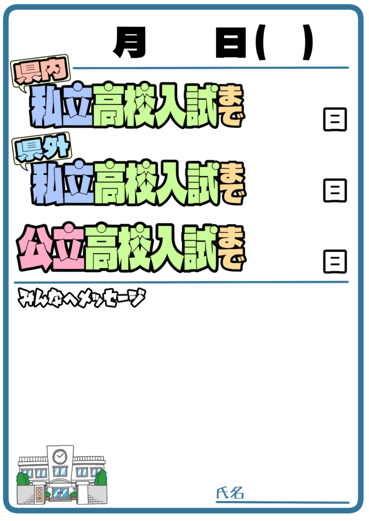 日付と残り日数を書き込めるスペースに加え、受験生みんなへのメッセージも書き込めるプリントタイプのカレンダー枠です。毎日の変化が一目で分かり、見通しをもって入試当日まで過ごせるよう工夫されています。背面黒板や掲示板にそのまま貼って使いやすいデザインです。