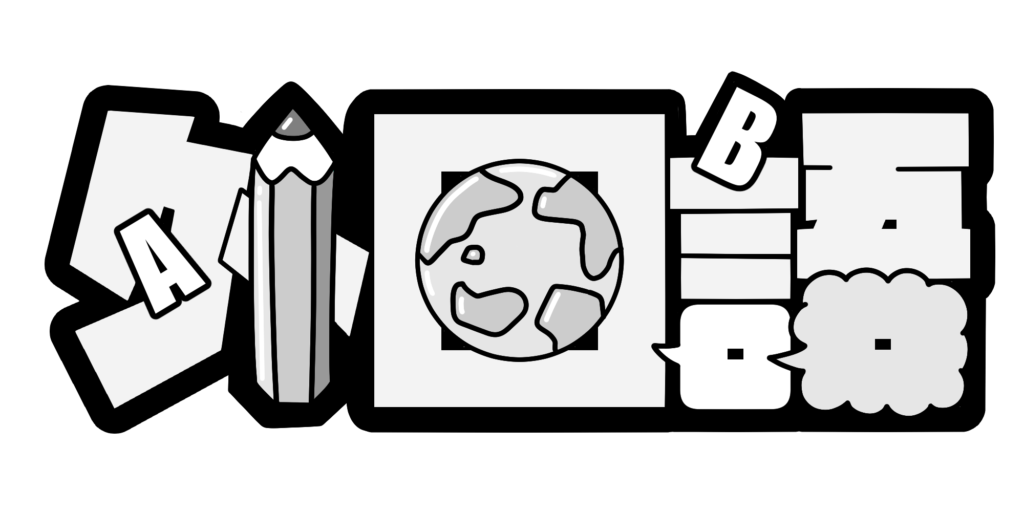 「外国語」の文字のまわりに、世界とつながる学びや、話す・書く・伝える活動をイメージさせるモチーフを配置した、親しみやすい文字イラストです。やさしく明るい雰囲気で、外国語に親しむ気持ちを自然に引き出せるデザインになっています。
