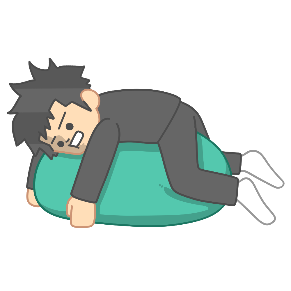 クッションにもたれたり寝転んだりしながら、少し気が抜けた表情をしている様子を描いたイラストです。テスト後や行事後、長期休み前後など、気持ちがゆるみやすい場面をやさしく表現できるデザインになっています。