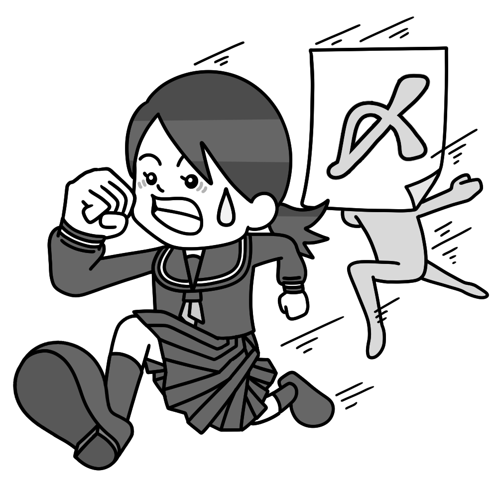 締切に追われて必死に走っている様子を、コミカルに表現したイラストです。宿題や課題の提出前の慌てた気持ちがひと目で伝わるデザインになっています。