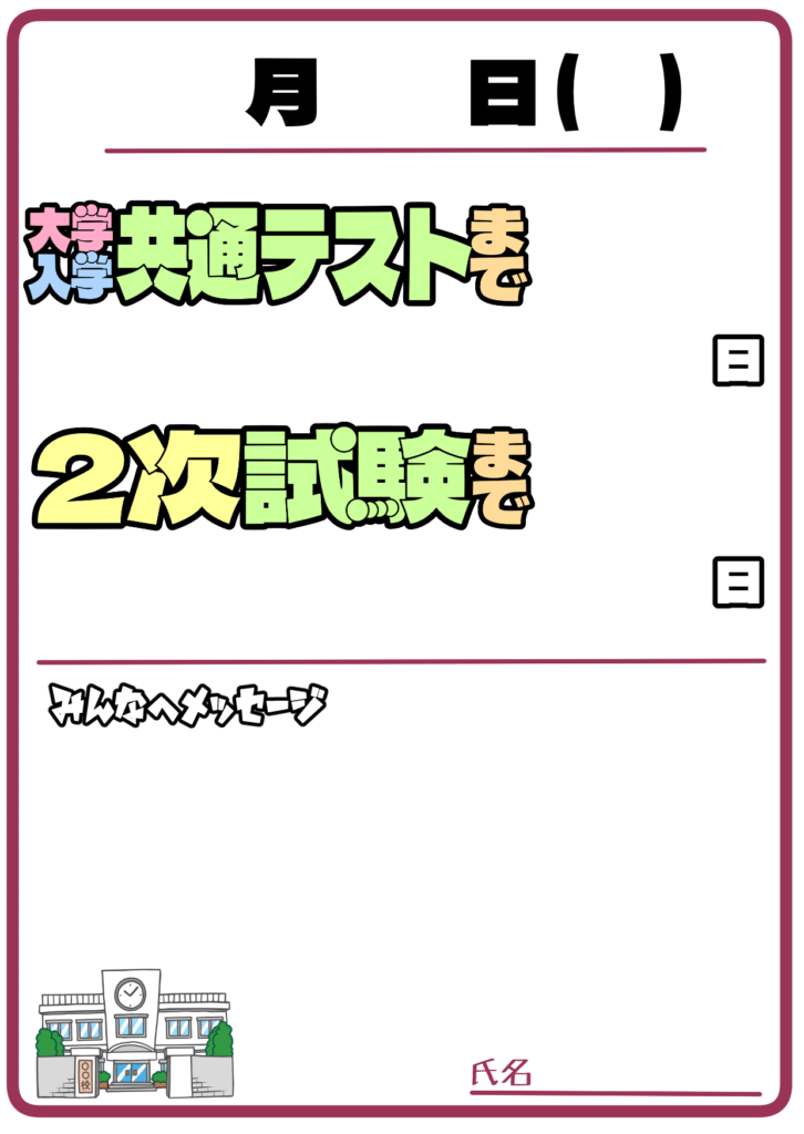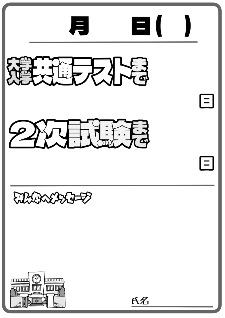 カウントダウンカレンダー枠(大学入試) 投稿日 2026-03-05 著者 hista006 カテゴリー フレーム・ライン 日付が書き込める大学入試までのカウントダウンカレンダーのイラストです。(大学入試、受験、共通テスト、日付)大学入試まで残りの日数を書き込めるカウントダウン形式のカレンダーのイラストです。日付や残り日数を書き込めるスペースがあり、受験までの時間を意識しながら勉強のモチベーションを高めるデザインになっています。 【使い方アイデア】・教室や塾の受験応援掲示に・進路指導室のカウントダウンボードに・受験勉強のスケジュール管理に・学級通信や受験応援プリントに カウントダウン カレンダー フレーム 受験 学活 掲示物 進路指導