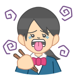 食べ物を口にしたあと、お箸を持ちながら「おいしくない…」というような表情をしている生徒を描いたイラストです。苦手な味や思っていた味と違ったときのリアクションを、コミカルで分かりやすく表現しています。