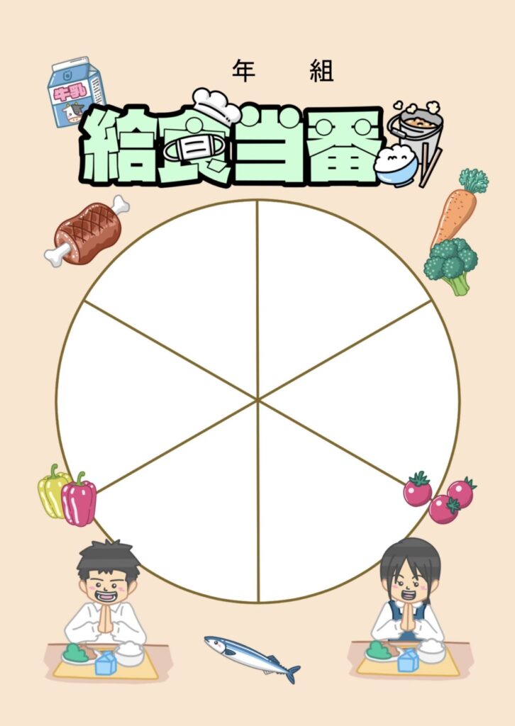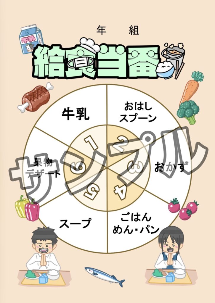 給食当番表(掲示物) 投稿日 2026-03-14 著者 hista006 カテゴリー フレーム・ライン 給食当番表のイラストです。(給食、当番、学校)学校の給食当番を決めるときに使える円形の当番表のイラストです。牛乳、おはし・スプーン、おかず、ごはん・めん・パン、スープ、果物・デザートなどの役割が分かれており、中央には1〜6の番号が配置された見やすいデザインになっています。 【使い方アイデア】・教室の給食当番掲示に・学級の当番表や係活動の掲示に・給食当番の役割説明プリントに フレーム 掲示物 給食