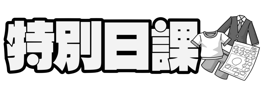 特別日課(ブレザー) 投稿日 2026-04-09 著者 hista006 カテゴリー 文字 「特別日課」の文字イラストです。(特別日課 日課変更 行事日課 スケジュール 見出し)制服の生徒や体操服の生徒、テストが添えられた、さまざまな活動がある一日をイメージしやすい文字イラストです。通常とは異なる流れが分かりやすく伝わり、特別な日課を知らせる場面に合います。 【使い方アイデア】・特別日課の時間割掲示に・日課変更のお知らせ資料に・行事やテスト日の予定掲示に・教室のスケジュールボードに 掲示物 文字 時間割
