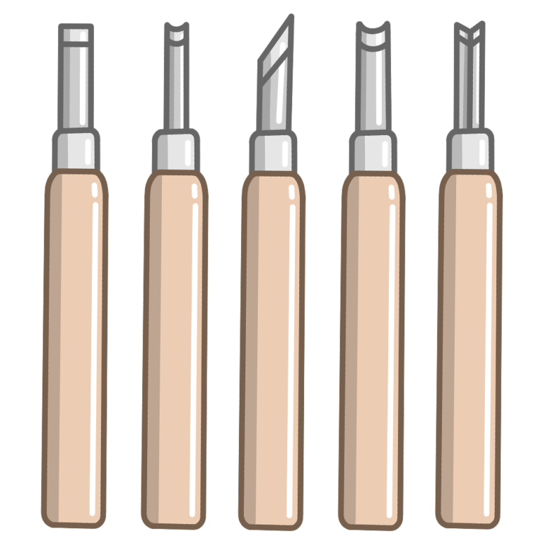 彫刻刀(5本セット)のイラストです。(図工、道具、彫刻刀、木版画) 図工や美術の授業で使われる代表的 […] -