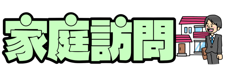 先生と家の絵が添えられた、「家庭訪問」の文字イラストです。 -
