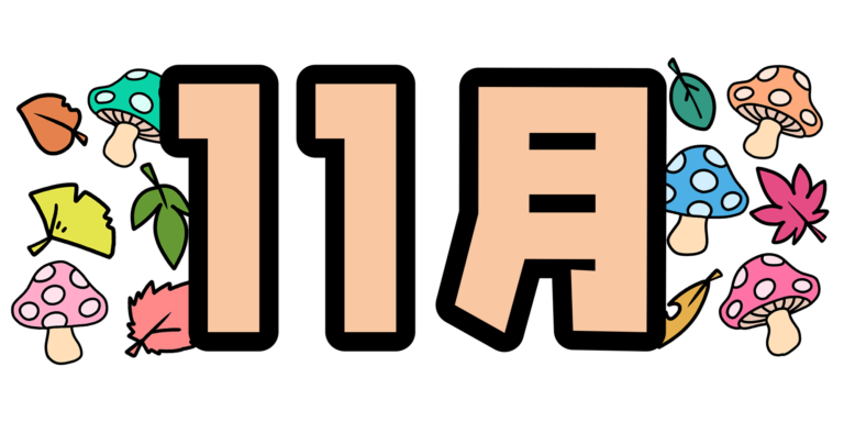 タイトルに使える、落ち葉ときのこの挿絵が入った十一月の文字のイラストです。