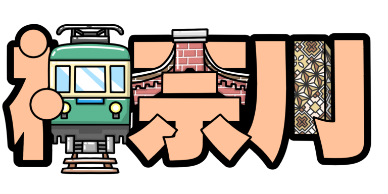 江ノ電と赤レンガ、箱根寄木細工を添えた「神奈川」の文字イラストです。(都道府県、観光地、乗り物、建造 […] -