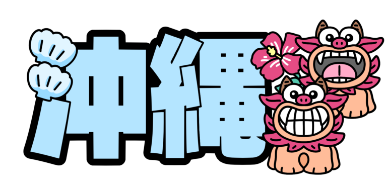 シーサーを添えた「沖縄県」の文字イラストです。(都道府県、地域紹介、観光、ハイビスカス、シーサー、守 […] -