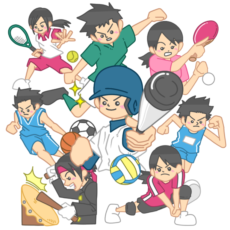 いろんなスポーツをしている人が集まったイラストです。(部活動、スポーツ) 野球、サッカー、テニス、バ […] -