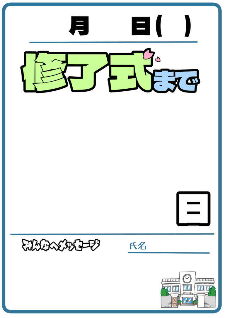 修了式までのカウントダウンと、クラスへのメッセージが書き込める枠(フレーム)イラストです。(カウント […] -