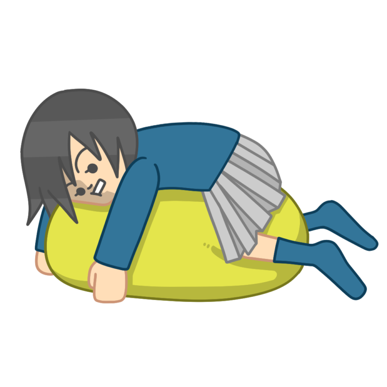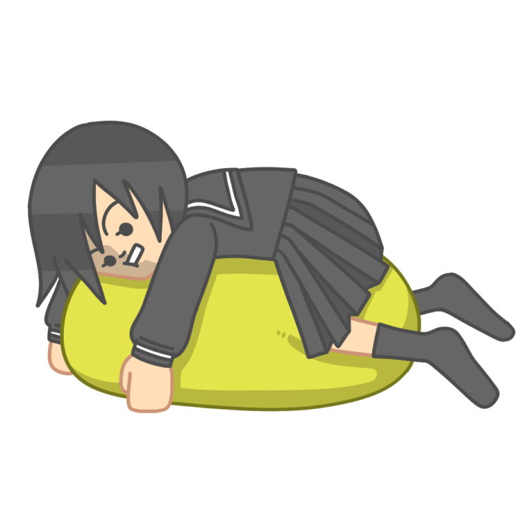 やる気が出ず、クッションの上でダラダラしている制服を着た女子生徒のイラストです。(宿題、やる気が出な […] -