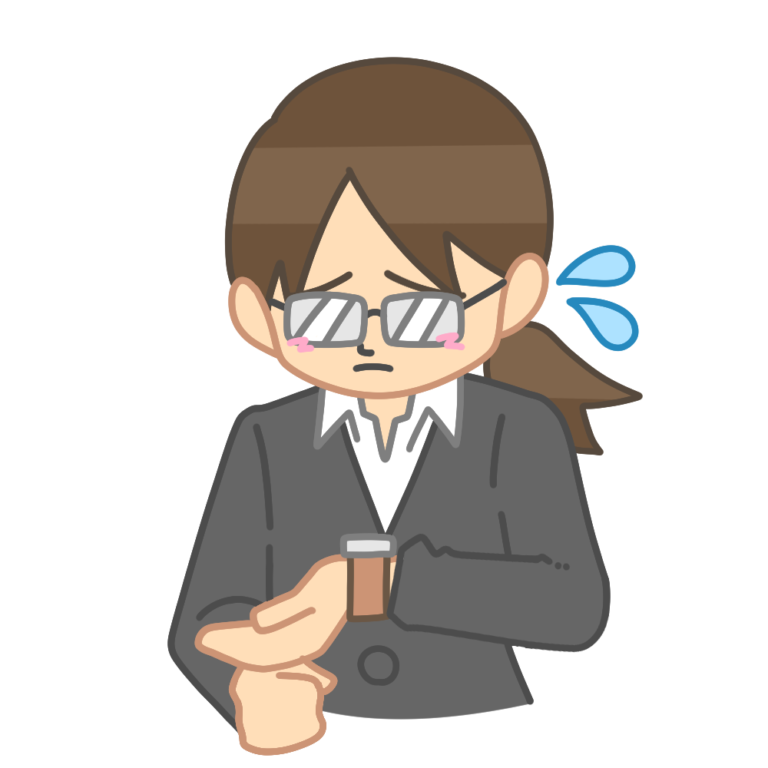 腕時計を見て困っている女性のイラストです。(時間、遅刻、焦り) 予定に間に合わない状況や、時間を気に […] -