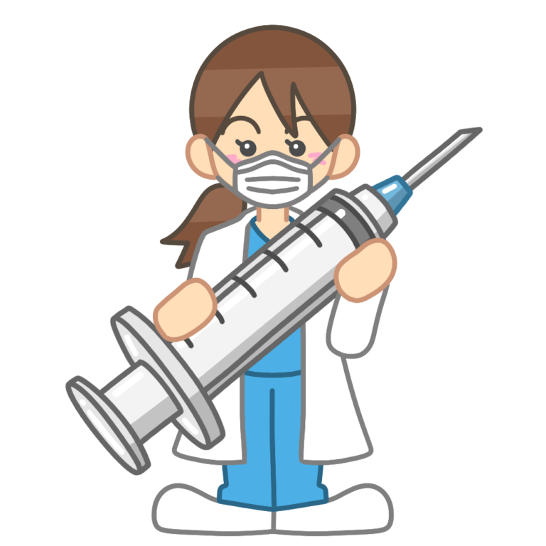 大きい注射器を持つマスクをつけた女性医者のイラストです。 大きな注射器を手にした医者をユーモラスに描 […] -